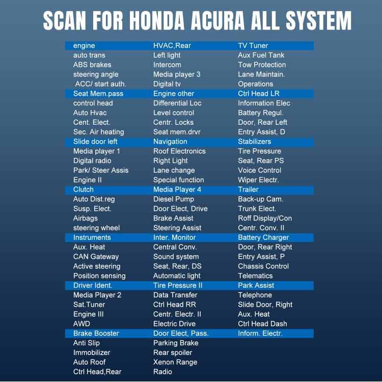 1. It is a professional full system diagnostic scanner for Honda and Acura series car. It supports all system diagnostics, including engine light, ABS, SRS,Transmission, SAS, ESP, EPB and other systems. This function is specially designed to diagnose all electronically controlled systems of a single vehicle Model.