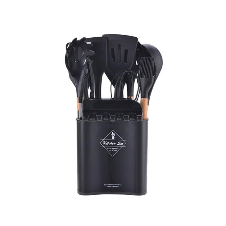 KU349 13 In 1 Storage Barreled Wooden Handle Silicone Kitchenware Set Non-Stick Cooking Spoon Shovel Kitchen Rack(Black)