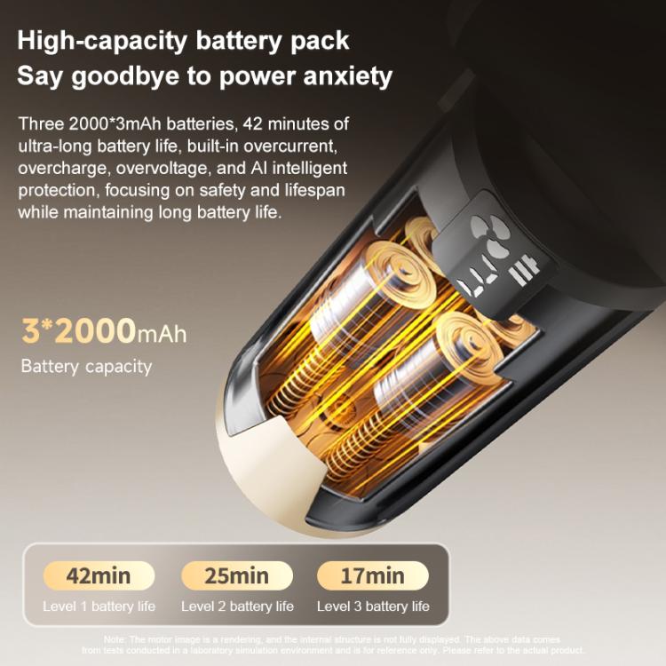 3. 2000 x 3mAh three batteries, 42 minutes long battery life, built-in over-current, over-charging, over-voltage, AI intelligent protection, in order to maintain a long life at the same time pay more attention to the safety and life expectancy