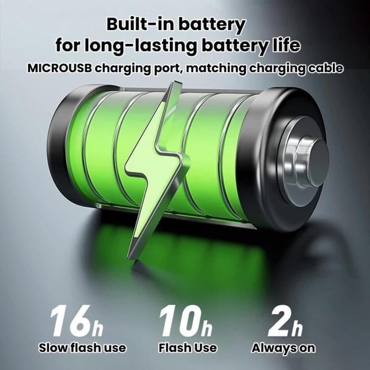 3. Built-in battery with extended runtime. Slow flash: about 16 hours; fast flash: about 10 hours; steady on: about 2 hours