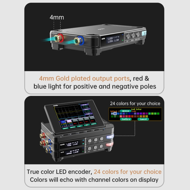 7. 4mm gold-plated output connector, positive and negative red and blue status indicators