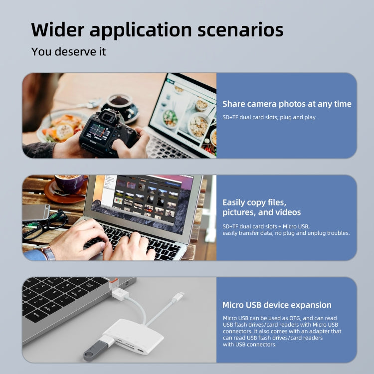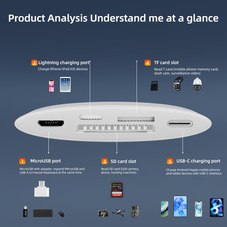 Type-C/8 Pin/USB-A multi-function adapter, using Micro USB female socket, SD/TF card slot can transfer data for three different interface devices, and can charge devices at the same time through Type-C interface and 8 Pin interface.