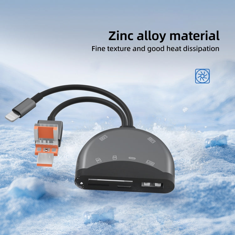 The Type-C/USB-A//USB-C 6-in-1 adapter is a multifunctional converter specially developed for the problem that it is too cumbersome to import photos from digital cameras to devices. By using the USB female socket, SD/TF card slot and USB-C female socket of the adapter, the digital camera can directly import photos to the device using a data cable and a converter. It can also expand the device with a low-power USB flash drive. At the same time, the USB-C female socket can charge devices with 8-pin interfaces and USB-C interfaces.
