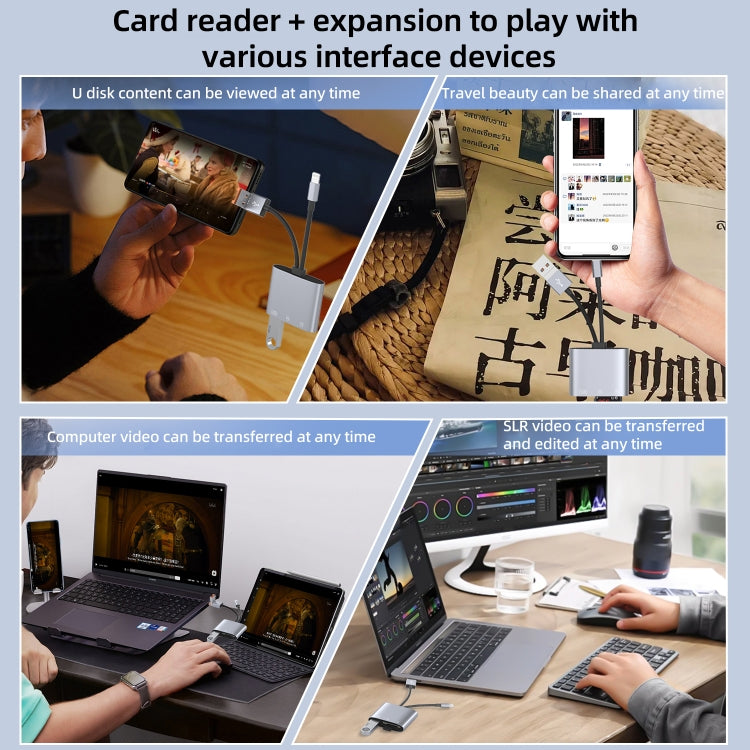 Type-C/USB-A/USB-C 3 in 1 multi-function adapter is a card reader suitable for different scenarios. Using the USB mother port of the adapter, the SD/TF card slot can transfer data for three devices with different interfaces.