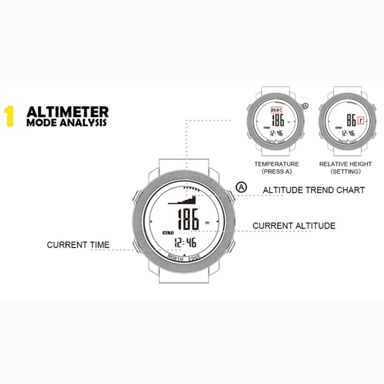 4. Function: humidity measurement, luminous, compass, height measurement, thermometer, world time, step, alarm, speed, chronograph, countdown, month display, weather forecast, barometric pressure measurement