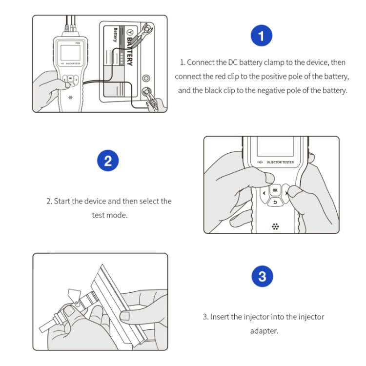 4. Powered by a DC jack power adapter, the continuous working mode can identify the quality of the fuel injector when the engine is turned off. This instrument can be used with any fuel pressure tester