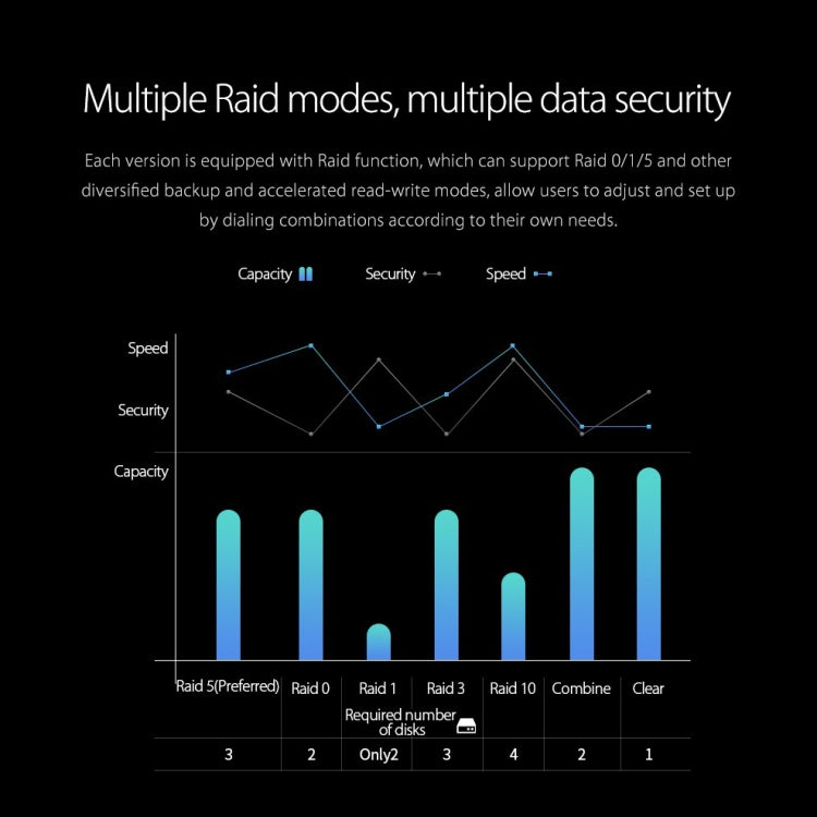 6. Support mode: RAID 0/1/3/5/10/JBOD/CLONE 7 disk array modes.
