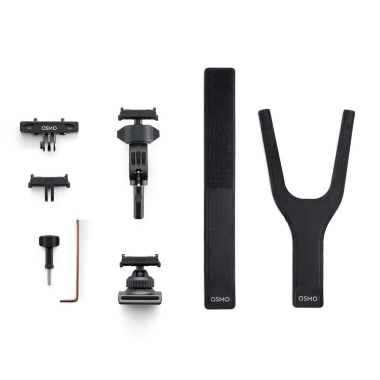1. The kit includes the Dual-Direction Quick-Release Adapter Mount, Dual-Direction 360-degree Wrist Strap, Dual-Direction Mini Handlebar Mount, Bike Seat Rail Mount, Locking Screw, and Hex Key. Switching camera position is effortless with the Dual-Direction Quick-Release Adapter Mount. Mount the camera to the handlebar with the Dual-Direction Mini Handlebar Mount to capture views ahead. Mount the camera to the bottom of the bike seat with the Bike Seat Rail Mount to capture companions behind you along the way. Detach the camera during break and secure it to the Dual-Direction 360° Wrist Strap for easy vlogging.