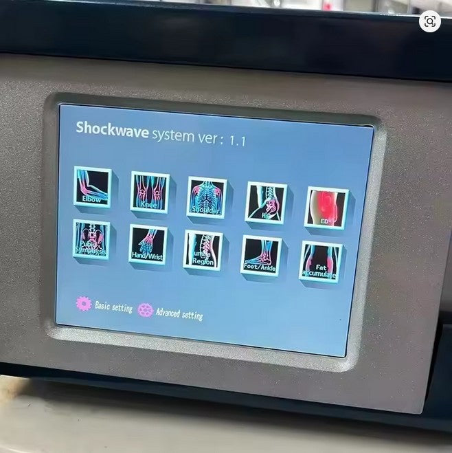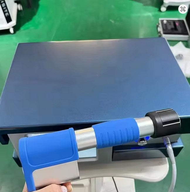 A modern shockwave therapy (ESWT) system used to treat chronic pain, trigger points, bursitis, tendinitis, heel spurs, Achilles tendinopathy, and other musculoskeletal conditions.
