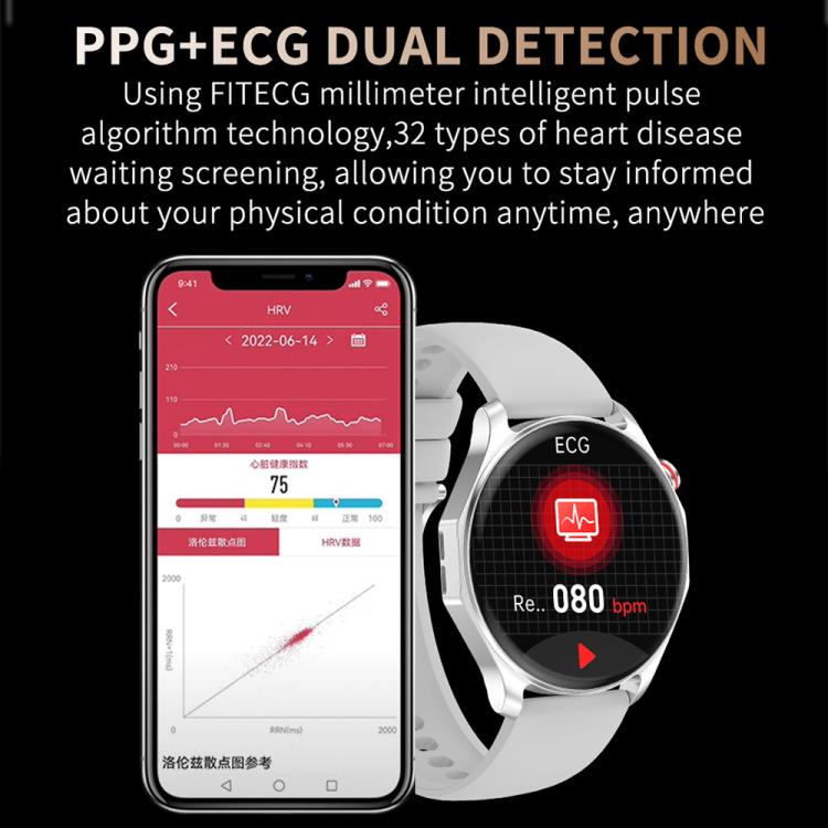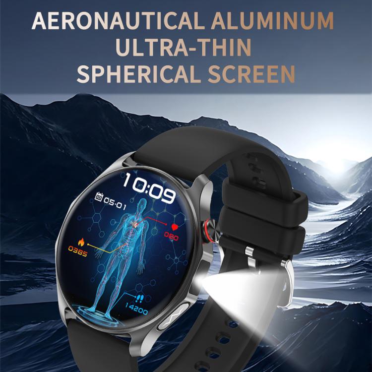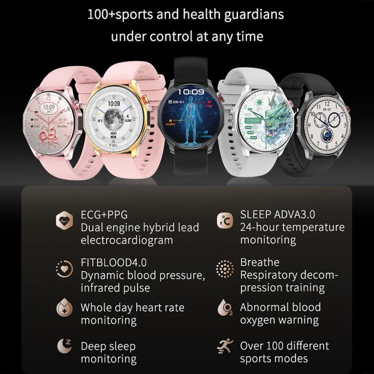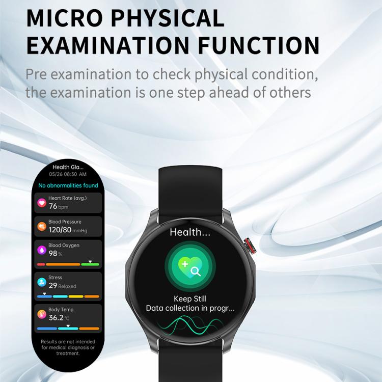 1. Main Functions: ECG measurement, body composition analysis, micro-health check, 24/7 heart rate monitoring, blood pressure, blood glucose, blood lipids, uric acid, blood oxygen, body temperature, HRV, METs test; calling, step counting, scientific sleep monitoring, calorie and distance tracking, music playback, stopwatch, countdown, calculator, weather display, female cycle tracking; remote photo capture, wrist-lift wake-up, find phone, call alerts (with number/name), message alerts, alarm clock, sedentary reminder, heart rate alarm; Bluetooth disconnection alert (requires APP activation), games, flashlight, breathing exercises, language settings, time and date adjustment.