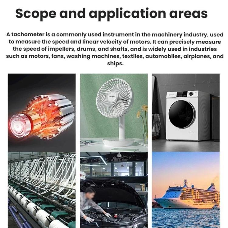10. A tachometer is a commonly used instrument in the machinery industry, used to measure the rotational speed and linear velocity of motors. It can precisely measure the rotational speed of impellers, rollers, and shafts, and is widely used in industries such as motors, fans, washing machines, textiles, automobiles, airplanes, and ships.