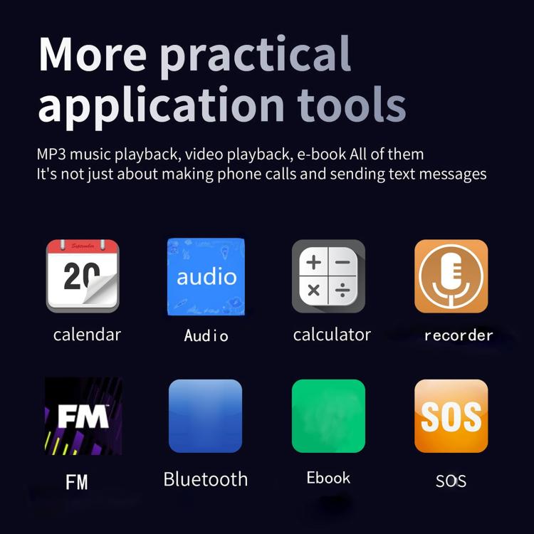 6. Features: Camera, DV, vibration, Audio, Video, Recorder, FM, SOS 5, Family number 9, Alarm, Calculator, Calendar, Ebook, BT, Facebook, WhatsApp