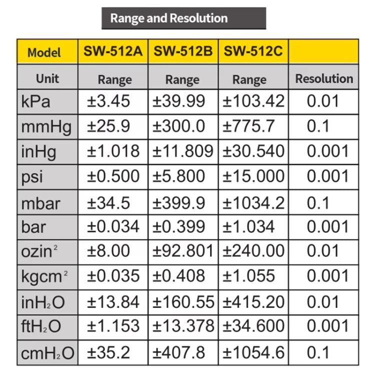 - SW-512A: +/-3.45KPa