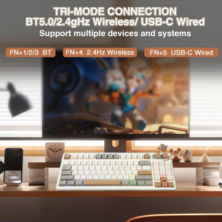 1. Tri-mode Connection & Multi-device Compatibility: Supports 3 connection modes (3 Bluetooth 5.0 channels, 2.4GHz wireless, Type-C wired), compatible with multiple devices and systems, with easy switching.