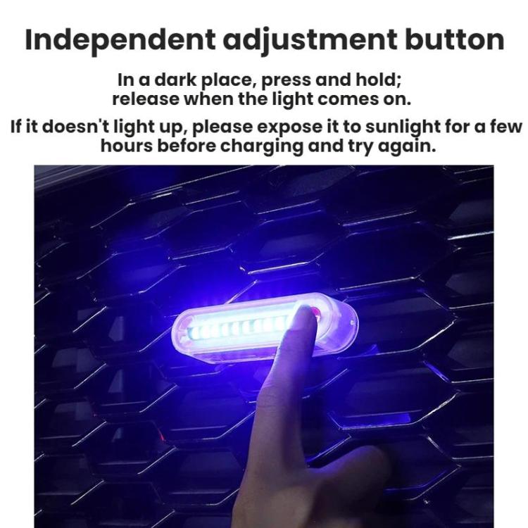 6. Independent adjustment button; press and hold in dark areas until the light illuminates, then release. If it doesnt light up, place it in direct sunlight for several hours to recharge and try again.