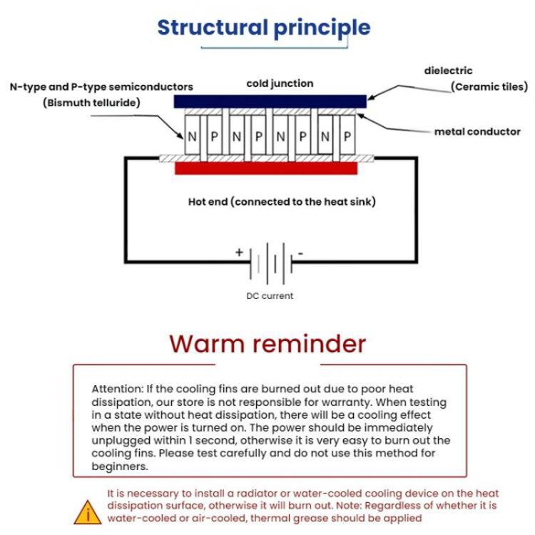 12. When testing without heat dissipation, there will be a cooling effect. If the power is turned on, the power supply should be unplugged immediately within 1 second, otherwise the refrigeration plate will be easily burned.