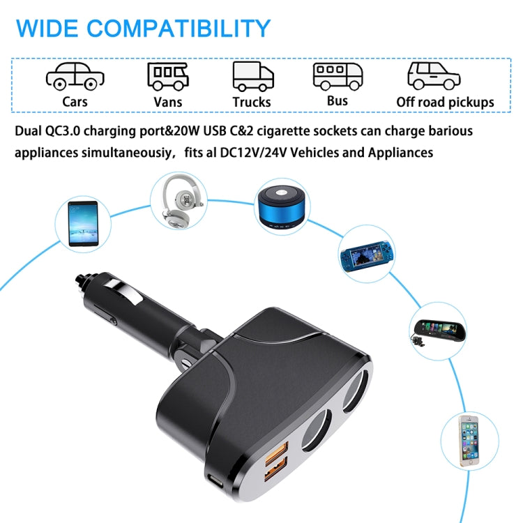 TR35 Car 2 in 1 Cigarette Lighter Extension Socket 20W PD Fast Charge QC3.0 USB Charger