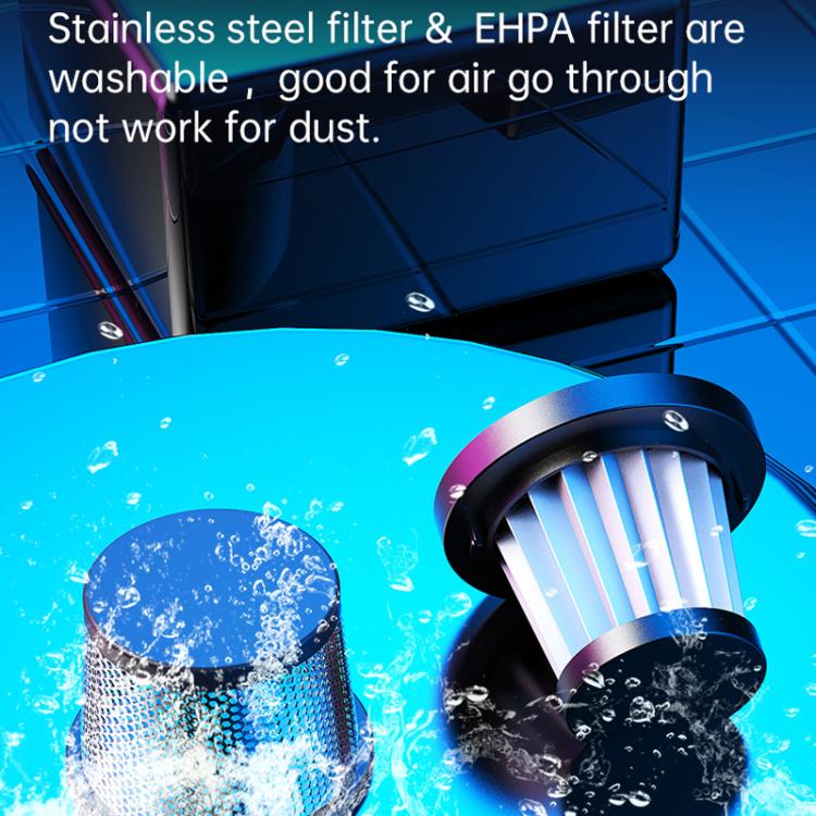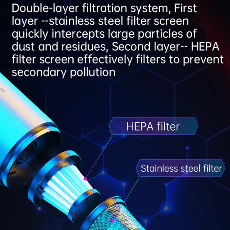 5. Double layer filtration system, one layer of stainless steel filter quickly intercept large particles of dust and debris, the second layer of HEPA filter effective filtration of fine dust, to prevent secondary pollution