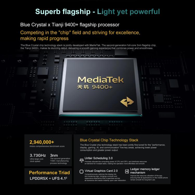 4. CPU: MediaTek Dimensity 9400+ Octa Core (1 x Cortex-X925 3.73GHz + 3 x Cortex-X4 + 4 x Cortex-A720)