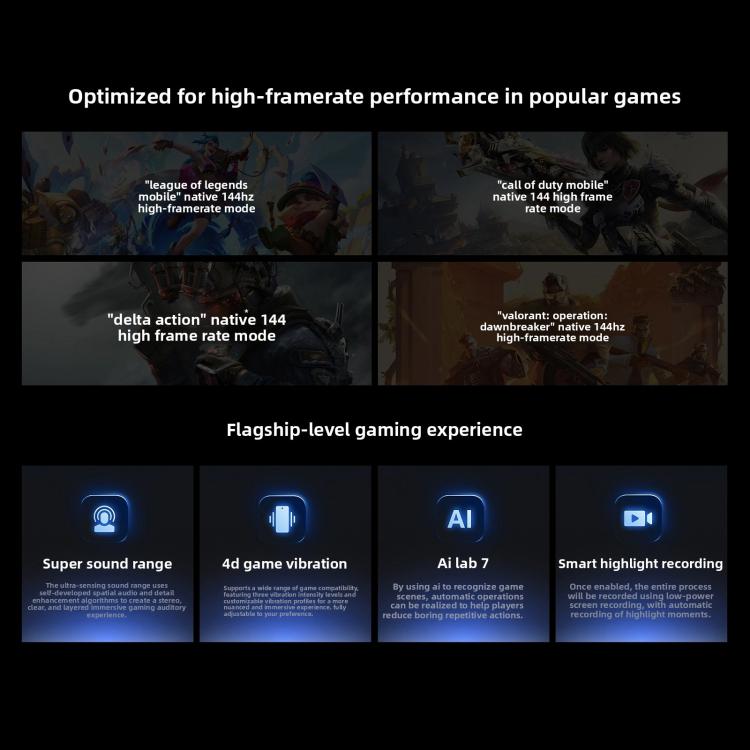 1. Type: AMOLED, 144Hz refresh rate, 94.57%, 19.64:9, 459PPI