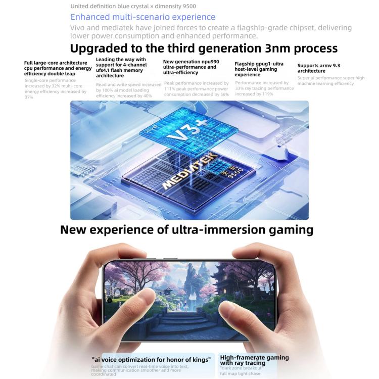 1. CPU: Dimensity 9500, 64-bit, octa-core, 3nm, 4.21GHz x 1+3.5GHz x 3 + 2.7GHz x 4