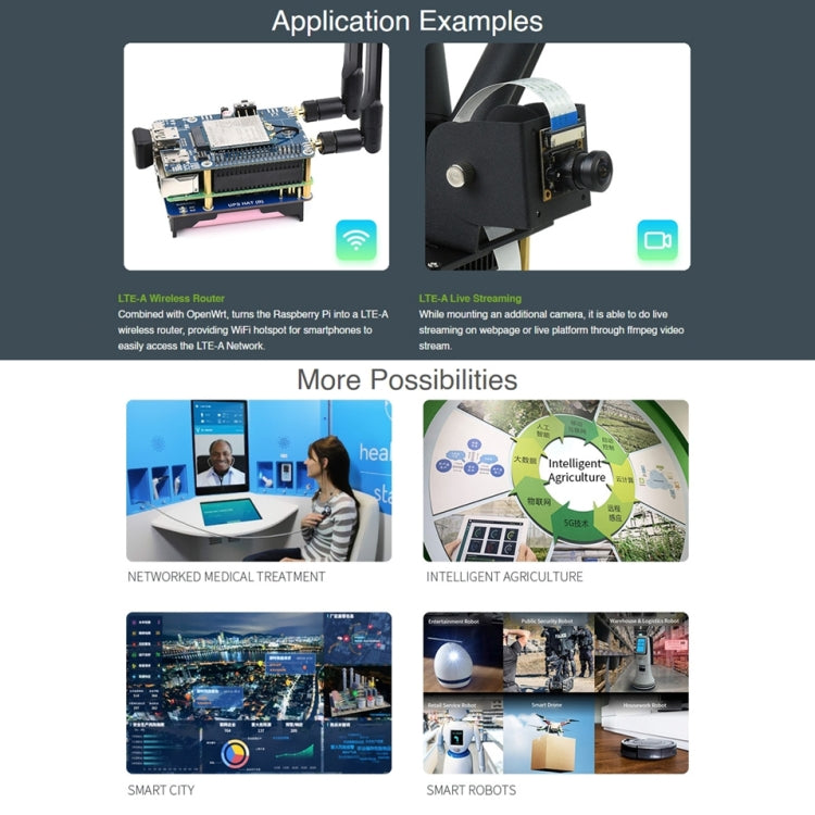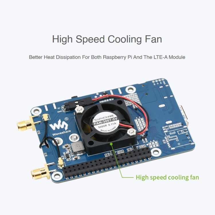 Features1. This is an LTE Cat 6 Raspberry Pi communication HAT with GNSS and up to 300Mbps (downlink) / 50Mbps (uplink) data rate. It is applicable for countries/regions including Europe, the Middle East, Africa, Asia-Pacific, Brazil... By connecting it to PC, Raspberry Pi or Jetson Nano host boards, it is easy to enable LTE-A high speed networking, cloud platform communication, SMS, and global GNSS positioning functions.