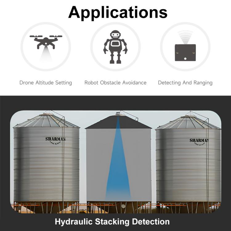 4. The anti-light interference ability is up to about 100KLUX illumination. It can be used as a distance measurement tool for distance detection, as a robot obstacle avoidance/route planning, and can also be used in fields such as ceiling detection and material level measurement.