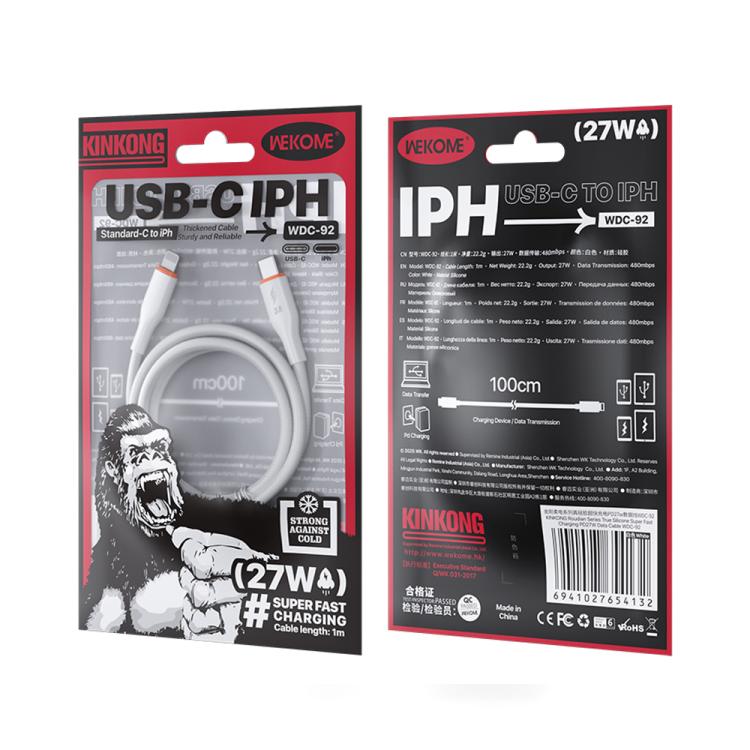 WK WDC-92 PD27W Type-C to 8 Pin Silicone Data Cable, Length: 1.2m(White)