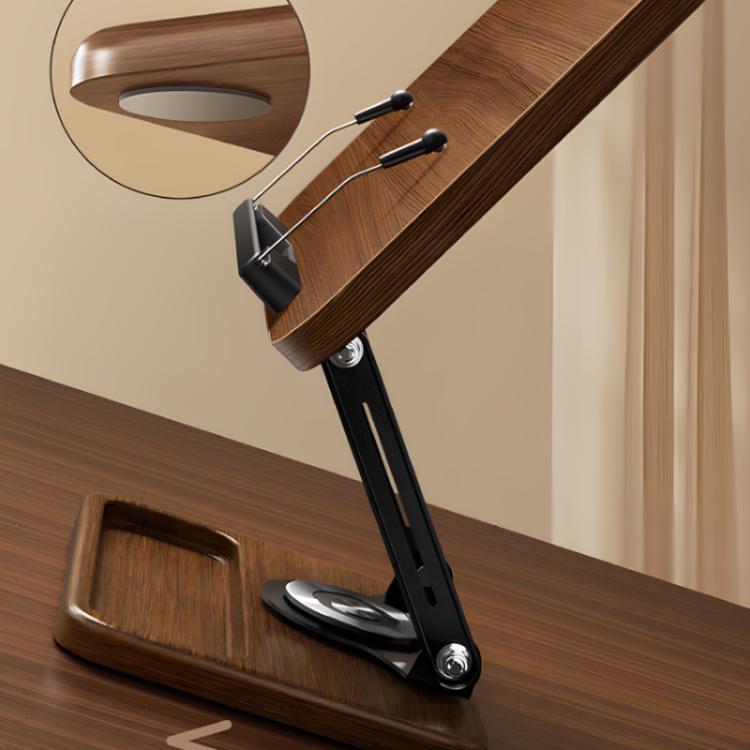 1. The stand is constructed from a high-density eco-friendly substrate with a realistic black walnut wood grain finish, paired with an aerospace-grade metal support frame and dual rods for enhanced stability and longevity.
