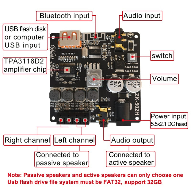 13. Reminder: There will be enough output power only when the audio input is enough and the power supply/current is enough. the higher the power supply voltage, the higher the relative power, and speakers with different impedances will have different output powers. in the case of sufficient voltage and current, the larger the horn ohms, the smaller the relative sound power