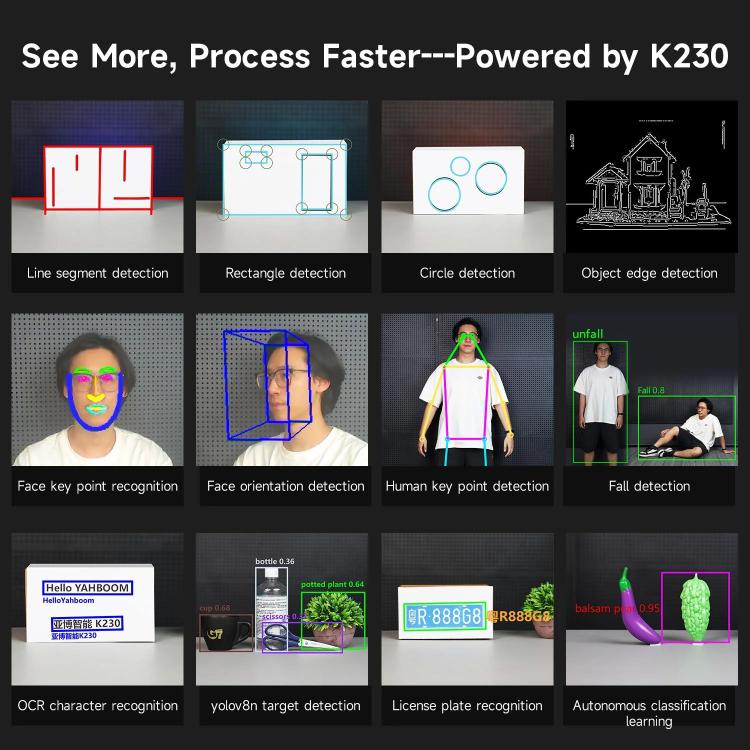 1. Yahboom K230 vision module is a high-performance, low-power embedded AI vision processing module designed for edge computing scenarios. It is designed based on the end-side AloT chip of the RISC-V architecture, with 6TOPS equivalent computing power and 1GB RAM. It can be connected to a variety of main controllers such as STM32, MSPM0, ESP32, Raspberry Pi, etc. through serial communication. Equipped with a powerful neural network acceleration engine, it supports AI vision tasks such as real-time image recognition, target detection, face recognition, and behavior analysis. It can be widely used in smart homes, maker education, programming robots, electronic design competitions and other occasions.