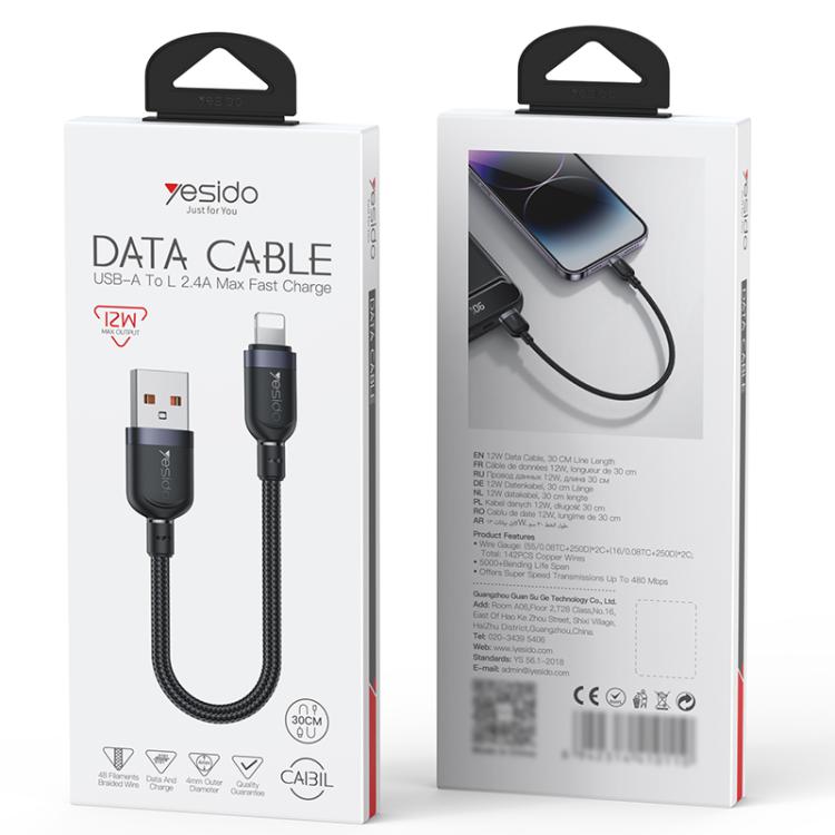Yesido CA131L 12W 2.4A USB to 8 Pin Charging Data Cable, Length:0.3m(Black)