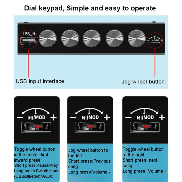 4. Input mode: AUX+Bluetooth+USB (dial-wheel button to switch modes and songs)